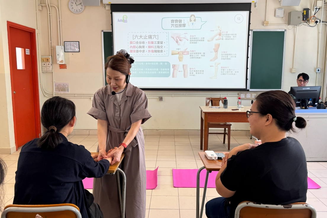 家長教師會於10月25日舉辦「趣味中醫藥–痛症紓緩親子課程」,課程內容涵蓋家長日常關注的肩頸痛、腰背痛及頭痛等問題,並由中醫師親自示範穴位按摩技巧、指導家長及學生即場練習,加深對中醫保健的認識。