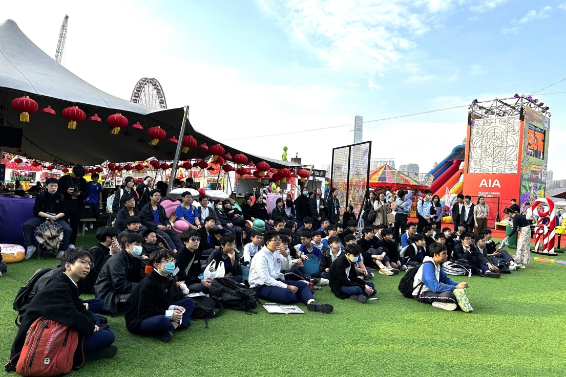 全級同學於舞台前集合,參加由主辦單位恆基兆業安排的專題簡介。透過講解,同學認識到中環海濱一帶由填海工程發展而成,並了解該區的歷史沿革與城市變遷,從地理環境、城市規劃到社會發展層面,深化對香港核心商業區發展脈絡的理解。同學隨即透過觀察場地規劃與人流安排,初步了解活動運作與城市空間的運用。