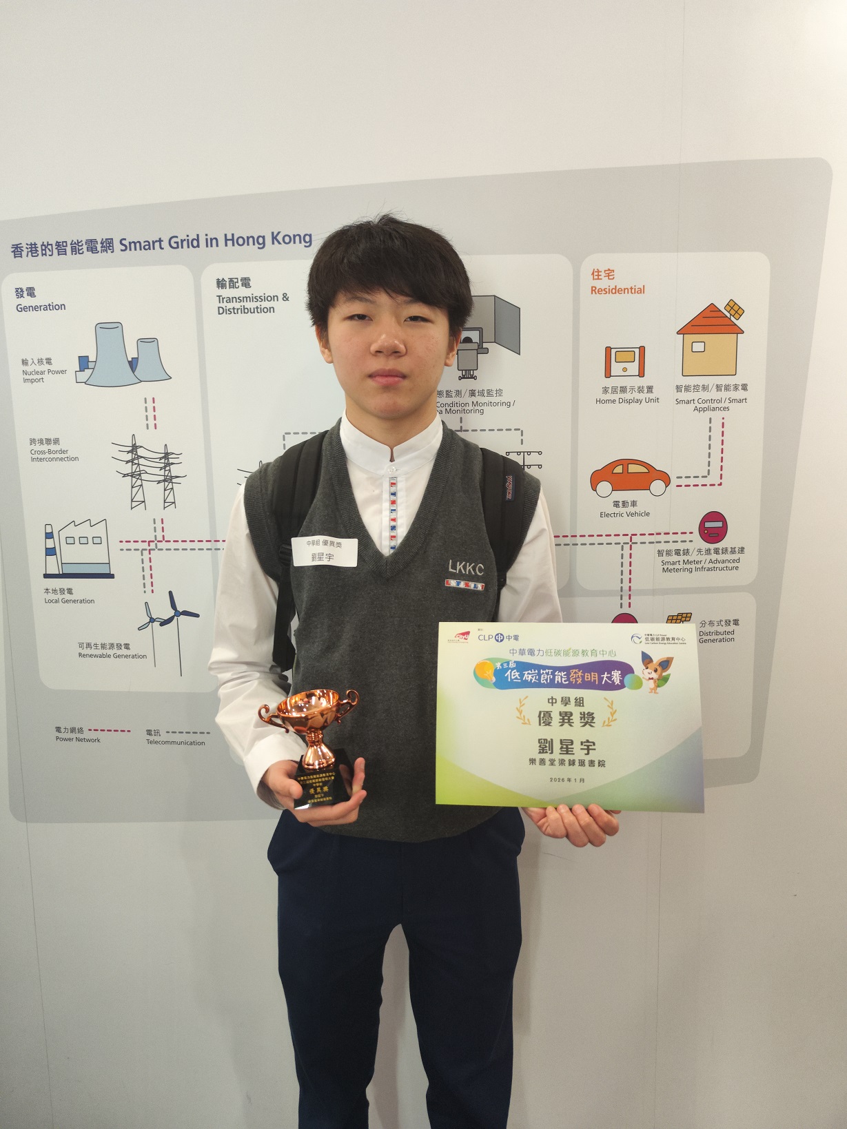 中二學生劉星宇參加由香港城市大學及中華電力低碳能源教育中心合辦的「第三屆低碳節能發明大賽2025」,在全港111間學校共797份優秀作品中脫穎而出,憑藉獨特的創意思維、深厚的環境保育意識及3D設計技巧,榮獲中學組優異奬。得獎學生更獲邀參加大亞灣一天遊學團,親身考察國家核電工程,深度拓展能源科技視野。