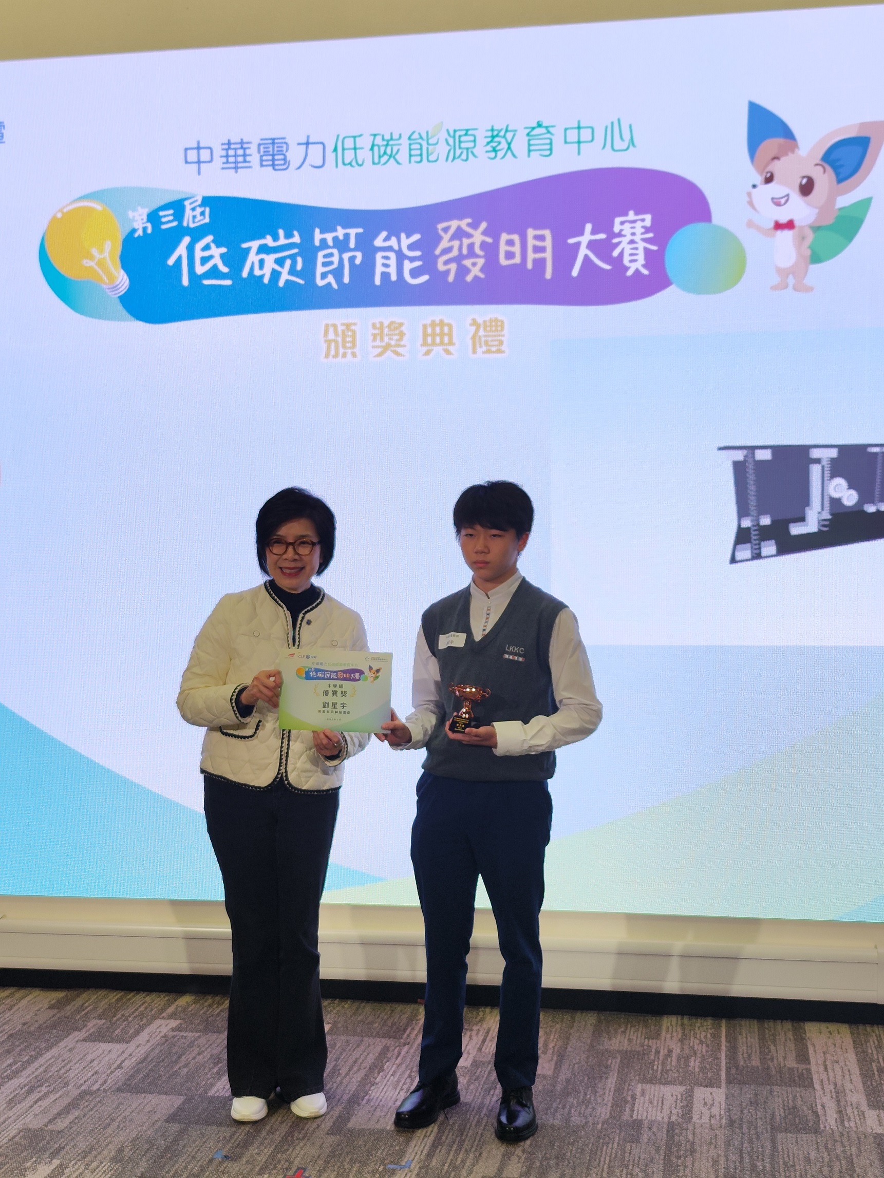 中二學生劉星宇參加由香港城市大學及中華電力低碳能源教育中心合辦的「第三屆低碳節能發明大賽2025」,在全港111間學校共797份優秀作品中脫穎而出,憑藉獨特的創意思維、深厚的環境保育意識及3D設計技巧,榮獲中學組優異奬。得獎學生更獲邀參加大亞灣一天遊學團,親身考察國家核電工程,深度拓展能源科技視野。