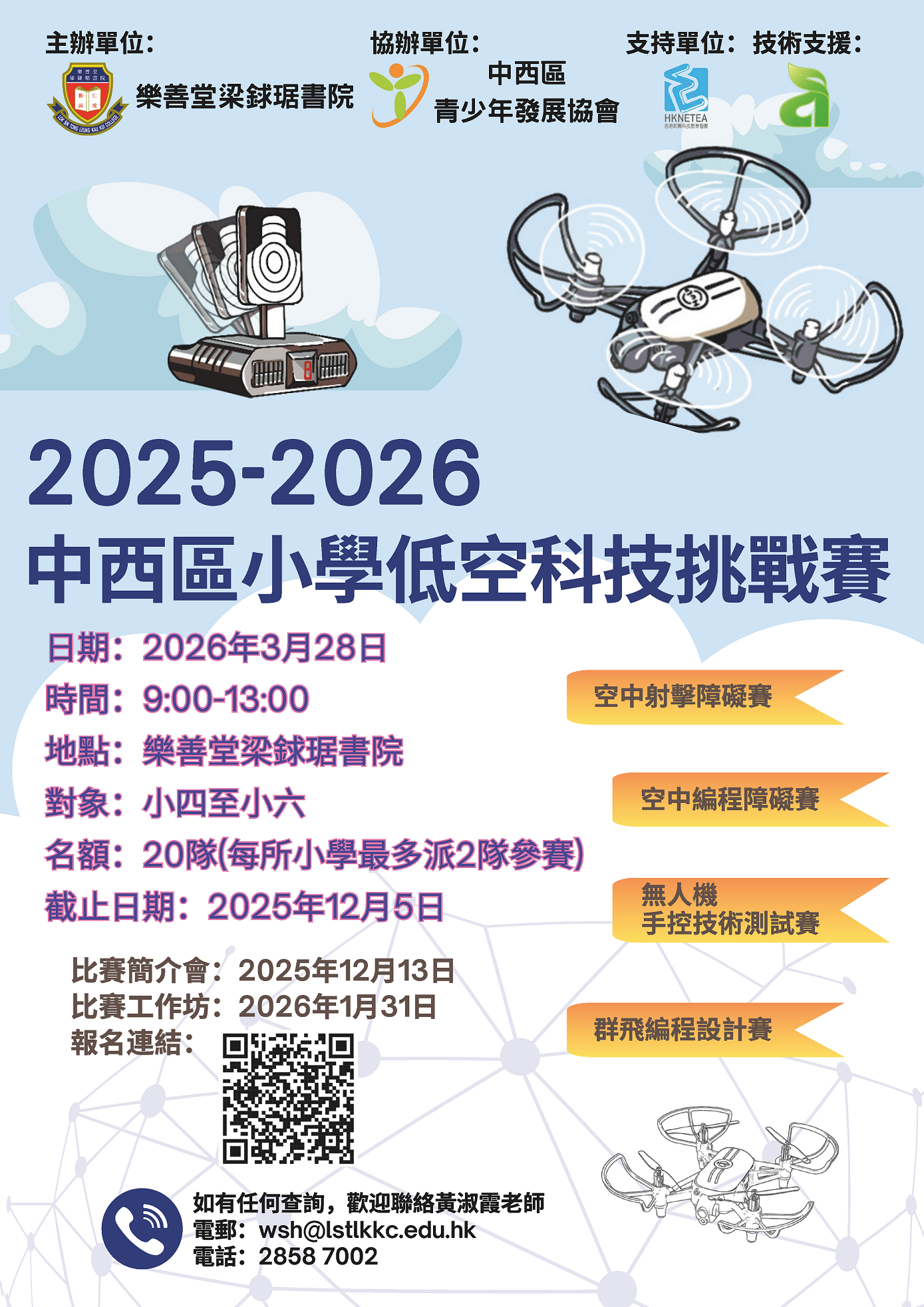 誠邀小學組隊參加由樂善堂梁銶琚書院主辦「2025-2026中西區小學低空科技挑戰賽」!