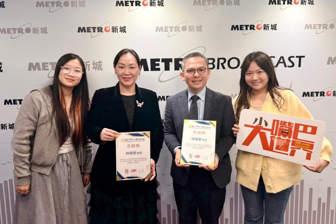 本校再度蟬聯香港中華文化發展聯合會(文聯會)「2024-25學年中華文化傳承單位」殊榮。承文聯會邀請,鍾耀基校長與林曉榮老師於 2026 年 3 月 3 日下午,以訪談嘉賓身份出席新城知訊台節目《小嘴巴大世界》。在節目中,鍾校長及林老師接受了主持葉泳詩及兩位小記者的訪問,深入分享本校在推廣中華文化、實踐文化傳承方面的成功經驗與校園點滴。